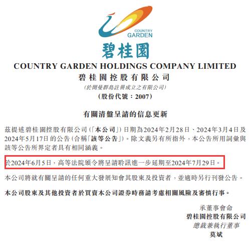 On June 6, Country Garden announced on the Hong Kong Stock Exchange that the Hong Kong High Court had ordered the hearing of the liquidation petition to be further postponed until July 29.