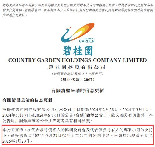 On the evening of July 29th, Country Garden announced on the Hong Kong Stock Exchange that with the support of the Coordination Committee representing bank creditors and the project team representing bondholders, the Hong Kong High Court approved the company’s application for extension, and the hearing of the liquidation petition was postponed until January 20th, 2025.