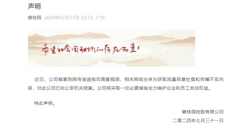 Country Garden Holdings Co., Ltd. issued a statement on the evening of July 31, saying that recently, the company noticed that the video of our executives was spread on the Internet, and the relevant network subjects maliciously fabricated and spread false content in order to obtain traffic. The company has reported the case to the public security organ. The company will take all necessary measures to fully safeguard the legitimate rights and interests of enterprises and employees.