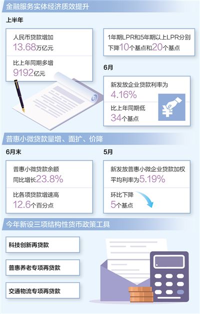 The data shows that in the first half of the year, the scale of social financing in China increased by 21 trillion yuan, an increase of 3.2 trillion yuan year-on-year, and RMB loans increased by 13.68 trillion yuan, an increase of 919.2 billion yuan over the same period of last year. At the same time, the central bank continued to release the reform potential of the loan market quotation rate (LPR). The one-year LPR and the five-year LPR decreased by 10 basis points and 20 basis points respectively. In June, the interest rate of new corporate loans was 4.16%, which was 34 basis points lower than the same period of last year. The comprehensive financing cost of enterprises decreased steadily, and the quality and efficiency of financial services to the real economy improved significantly.