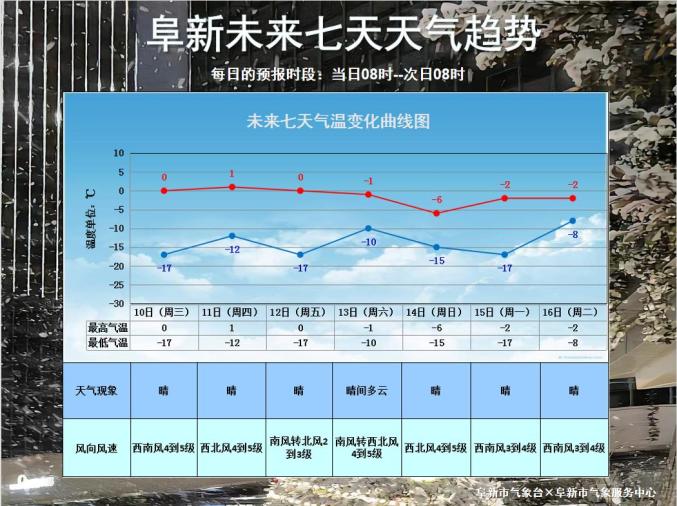 In terms of temperature, the highest daytime temperature in our city will be relatively stable in the next seven days. Except for the highest temperature of minus 6℃ on the 14th, it will fluctuate slightly between 1℃ and minus 2℃ in other days. It is worth noting that the minimum temperature fluctuates greatly in the morning and evening, and the minimum temperature on the morning of the 11th, 13th and 16th is around minus 17℃. Citizens and friends should pay attention to cold protection when going out in the morning, especially to keep their heads warm.