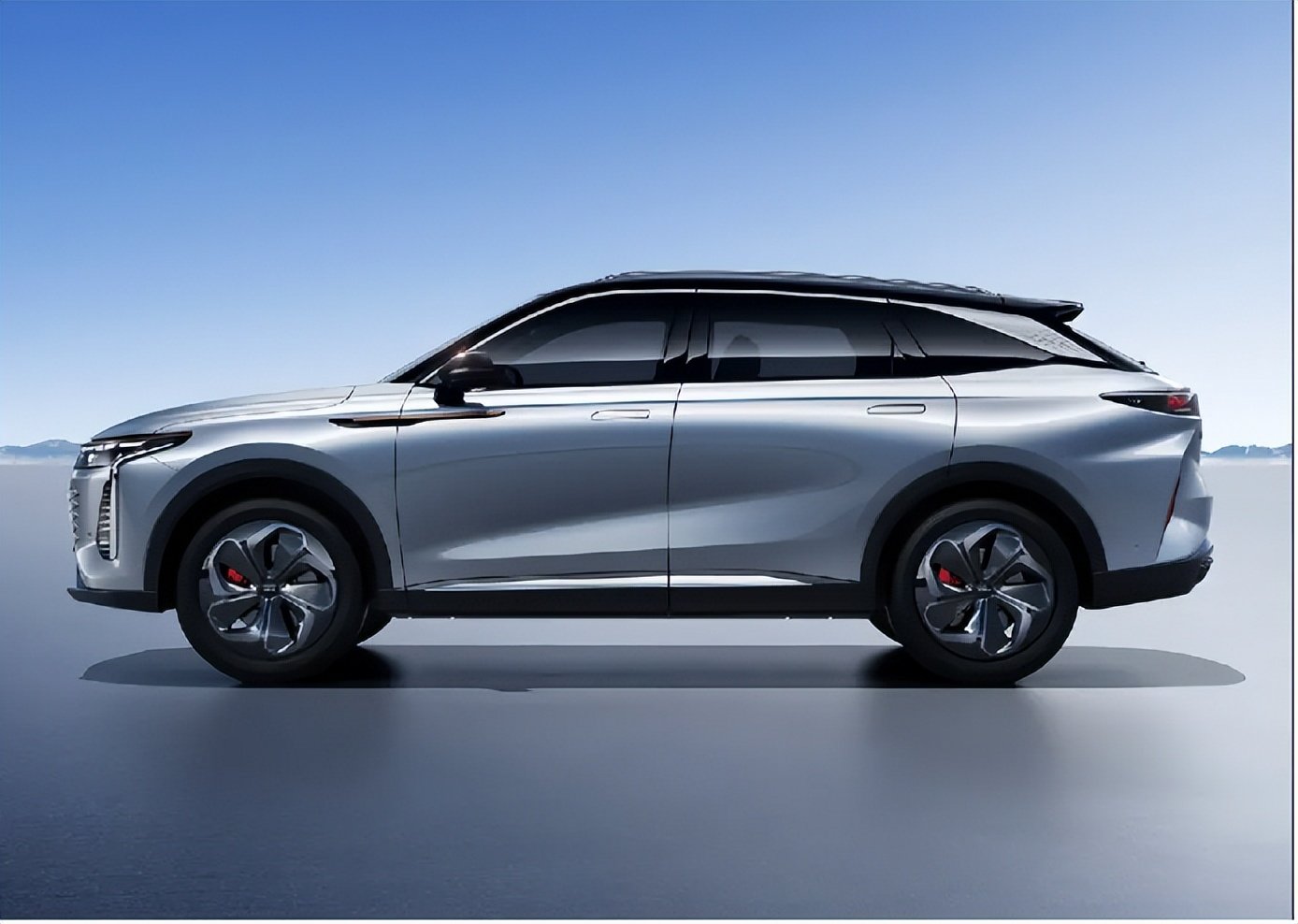 Coming to the side, the new car adopts a sporty coupe SUV shape and a hidden door handle design. The new car has a slightly low body posture, a round and smooth waistline and a rich shape. The window frame, the outer rearview mirror shell and the wheel eyebrows are blackened, and the roof rack is decorated with chrome trim. The five-spoke low wind resistance rim is adopted below, and the rim size is available in 18/19/20 inches. The red calipers inside are faintly visible, which is very eye-catching.