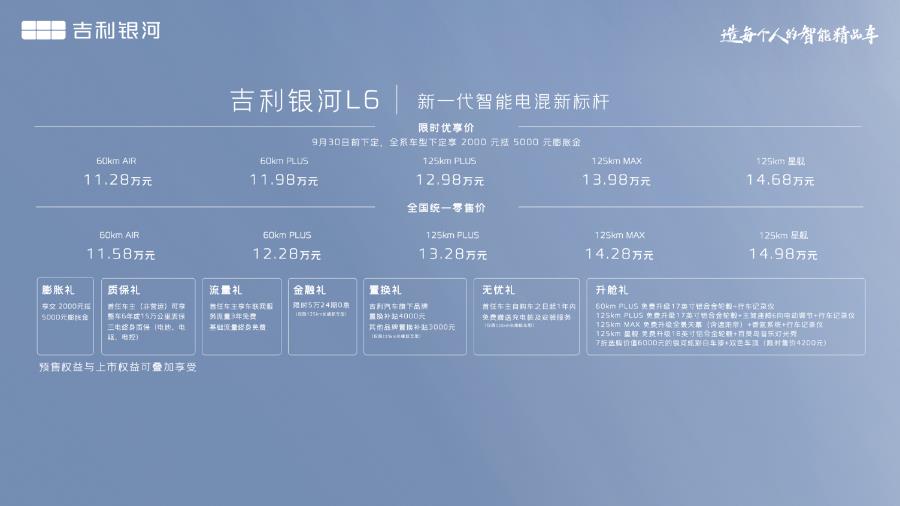 On September 16, Geely Galaxy L6 was officially launched, launching 60km pure electric battery life AIR version, PLUS version and 125km pure electric battery life PLUS version, MAX version and starship version, a total of five models, the national unified retail price is 11.58~ 149,800 yuan, will also enjoy seven car purchase gifts.