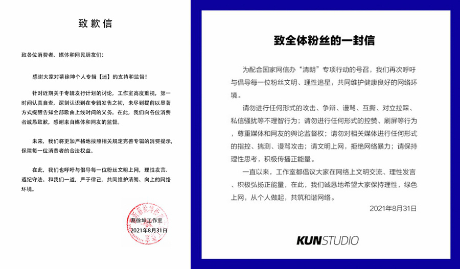 Cai Xukunfang said that in the future, he will more strictly follow the relevant regulations to improve the album consumption tips and protect the legitimate rights and interests of every consumer. At the same time, he sent a letter to fans, calling for fans to use the Internet in a civilized manner, speak rationally, and abide by the law: "Please do not engage in any form of attack, argument, abuse, mutual tearing, opposition, private message harassment and other irrational behaviors; please do not engage in any form of like control, screen swiping and other behaviors, and respect the public opinion supervision rights of the media and netizens; please do not engage in any form of accusations, speculation, and abusive attacks on relevant media."
