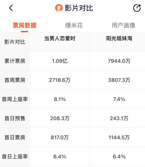 On the sixth day of release, When Men Are in Love surpassed other films in the box office and became a one-day champion. But two days later, it was overwhelmed by the newly painted film, but the gap between the two was not too big, and it was overtaken on June 21. And "Sunshine Sisters Amoy" was far out of the top five in the single-day box office list.