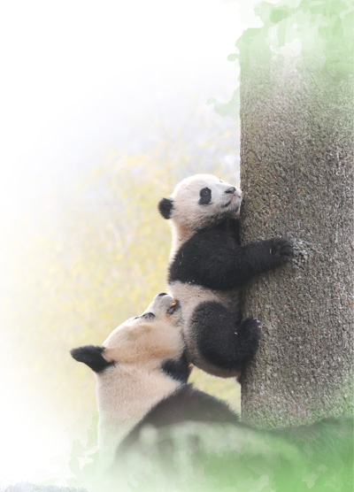 Mother panda teaches her cubs to climb trees. Photo by Xue Yubin