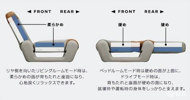 It is particularly worth mentioning that the two-in-one seats in the second row are cleverly designed.The cushion structure with different hardness on the front and back surfaces is adopted, which can realize the switching of driving mode, lathe mode and living room mode through different folding modes.