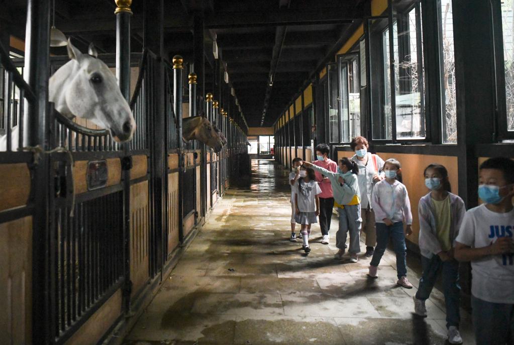 At the Khan Blood Horse Base in Xinjiang Ancient Ecological Park, several children observe the Khan Blood Horse under the introduction of a tour guide (photo taken on June 16, 2022). Photo by Xinhua News Agency reporter Wang Fei