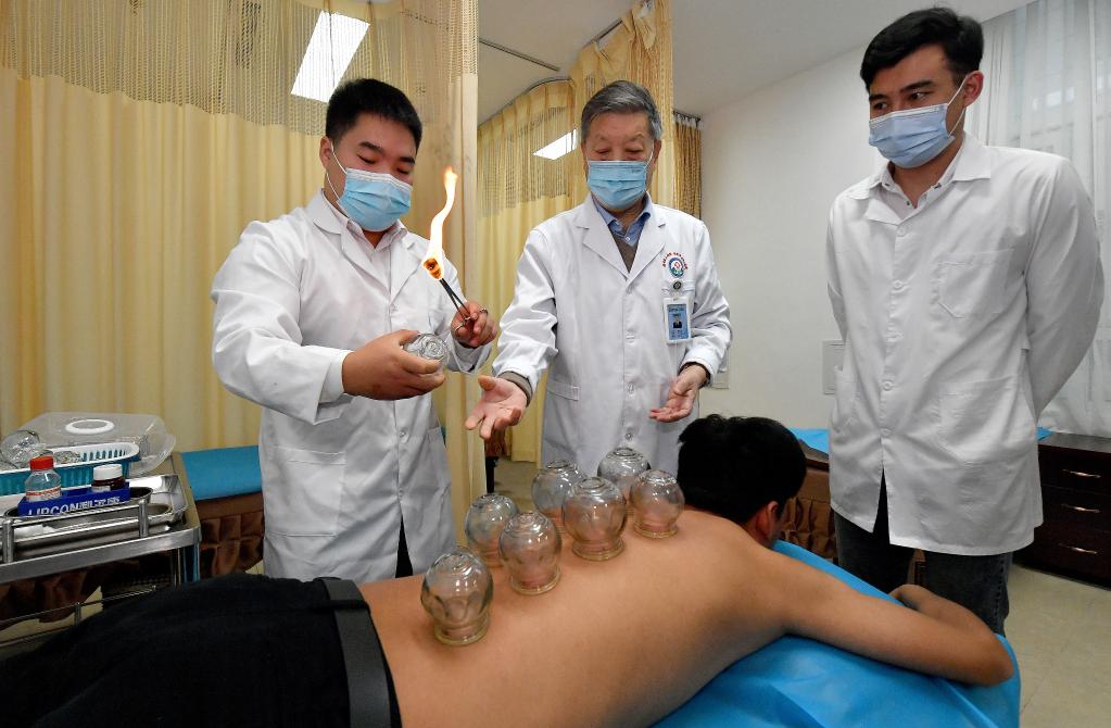 On November 10, 2020, Jia Chengwen (middle), a professor at the School of Acupuncture, Moxibustion and Massage, Shaanxi University of Traditional Chinese Medicine, instructed Ma Wenxuan (right) to perform cupping. Photo by Liu Xiao, reporter of Xinhua News Agency