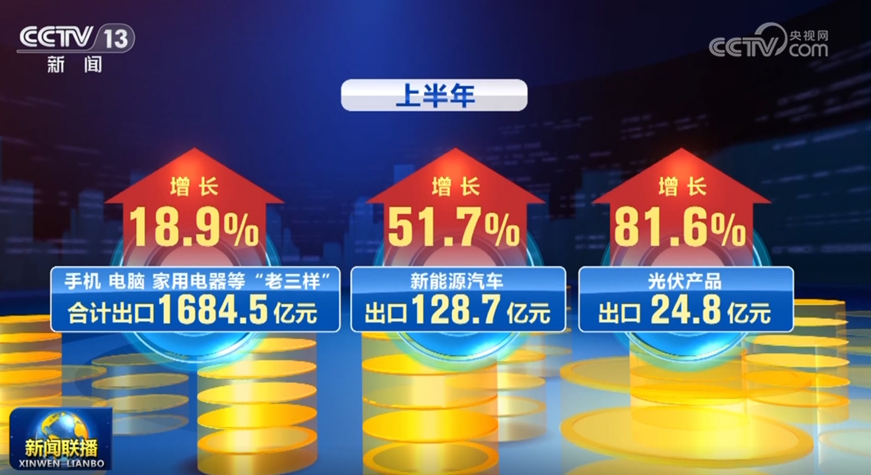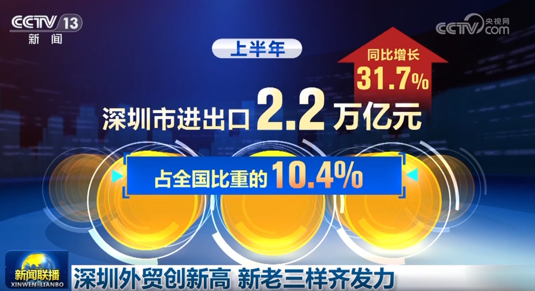 According to customs statistics, in the first half of the year, Shenzhen’s import and export amounted to 2.2 trillion yuan, up 31.7% year-on-year, accounting for 10.4% of the national total. The total export of "old three samples" such as mobile phones, computers and household appliances was 168.45 billion yuan, an increase of 18.9%; The export of new energy vehicles was 12.87 billion yuan, an increase of 51.7%; The export of photovoltaic products was 2.48 billion yuan, an increase of 81.6%.