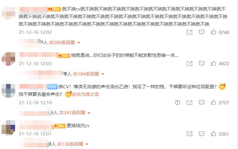 Dissatisfied with the new CV, Mrs. Lu began to defend her rights in the comment area and beyond. However, the official obviously didn’t want to find a new CV and change people, so he didn’t respond quickly. "The Northern Lights must be made aware of the seriousness of the matter." As a new CV, Adan bore the brunt of the players’ anger. Some "Mrs. Lu" denounced his personal Weibo and his dubbing studio Weibo, saying that his poor level ruined Lu Chen.