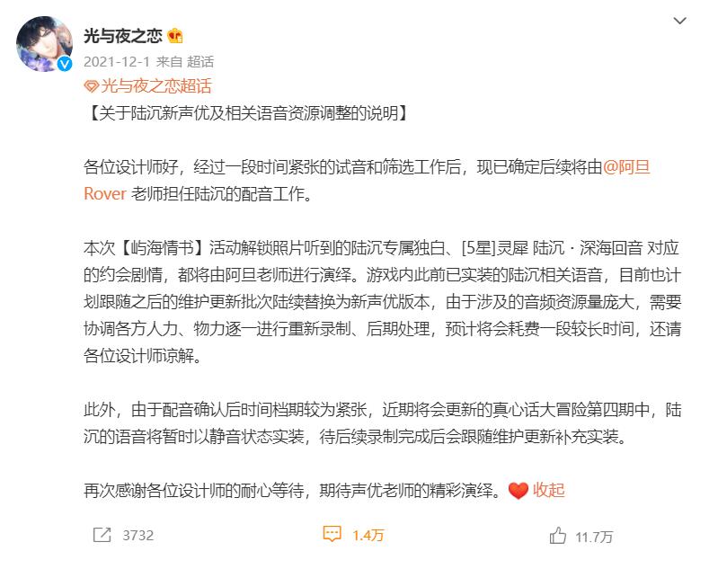 Shortly after the scandal broke out, Guan Wei issued a document saying that he had ended cooperation with Li Yuantao and was looking for a new CV for Lu Chen. At the beginning of December, the new seiyuu was put in place, and Guan Wei said that the new card to be launched soon would be dubbed by the new CV Adan, and the installed Lu Chen voice (Li Yuantao version) would be gradually replaced by Adan version.